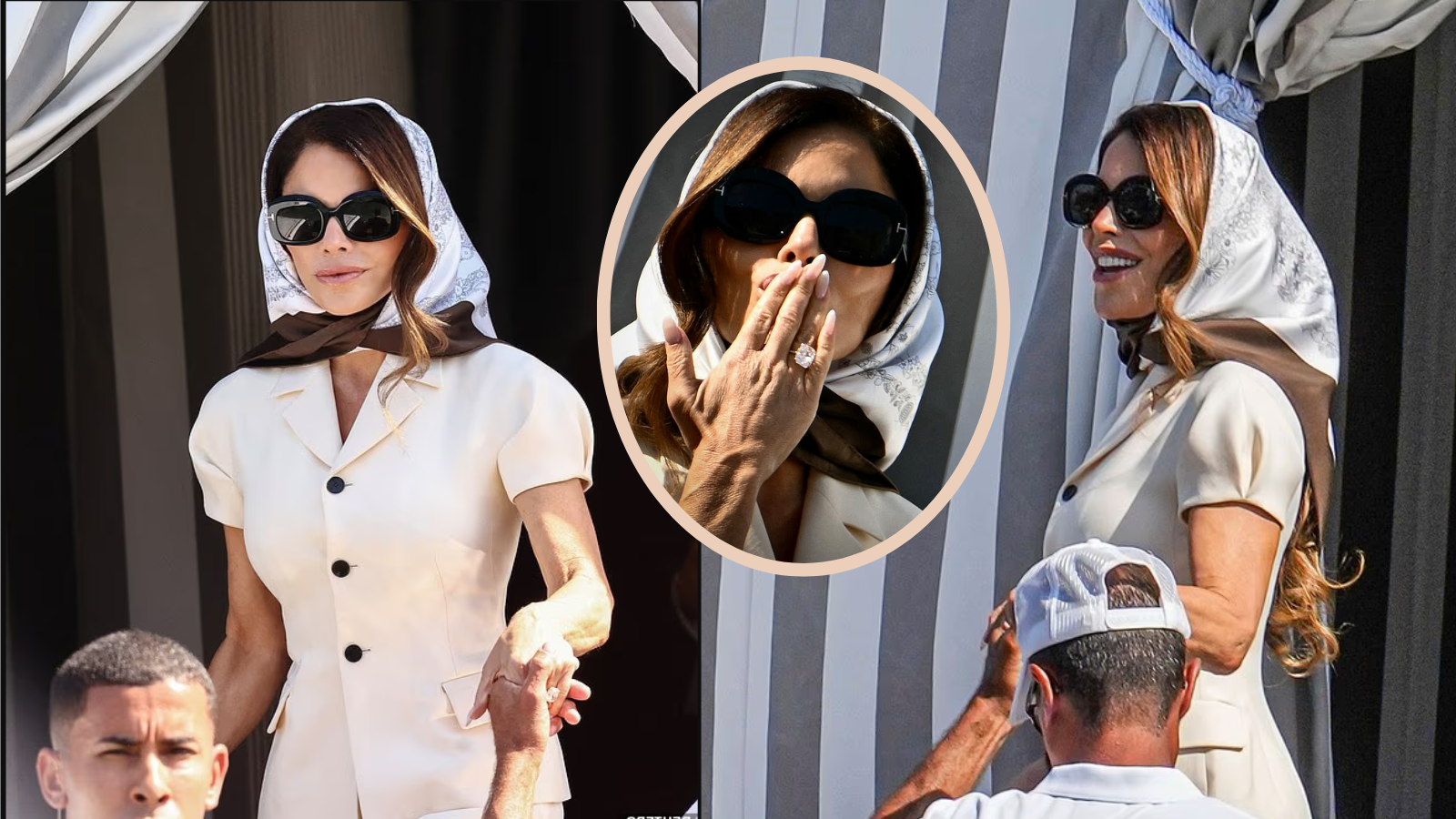Stylist Lisa Talbot said Lauren’s choice of a sheer white headscarf, tied under the chin, paired with oversized designer sunglasses, perfectly captured the iconic style of Jackie O and Sophia Loren. The scarf, draped over her brunette waves and gently blowing in the breeze, added softness and a romantic, mysterious vibe.