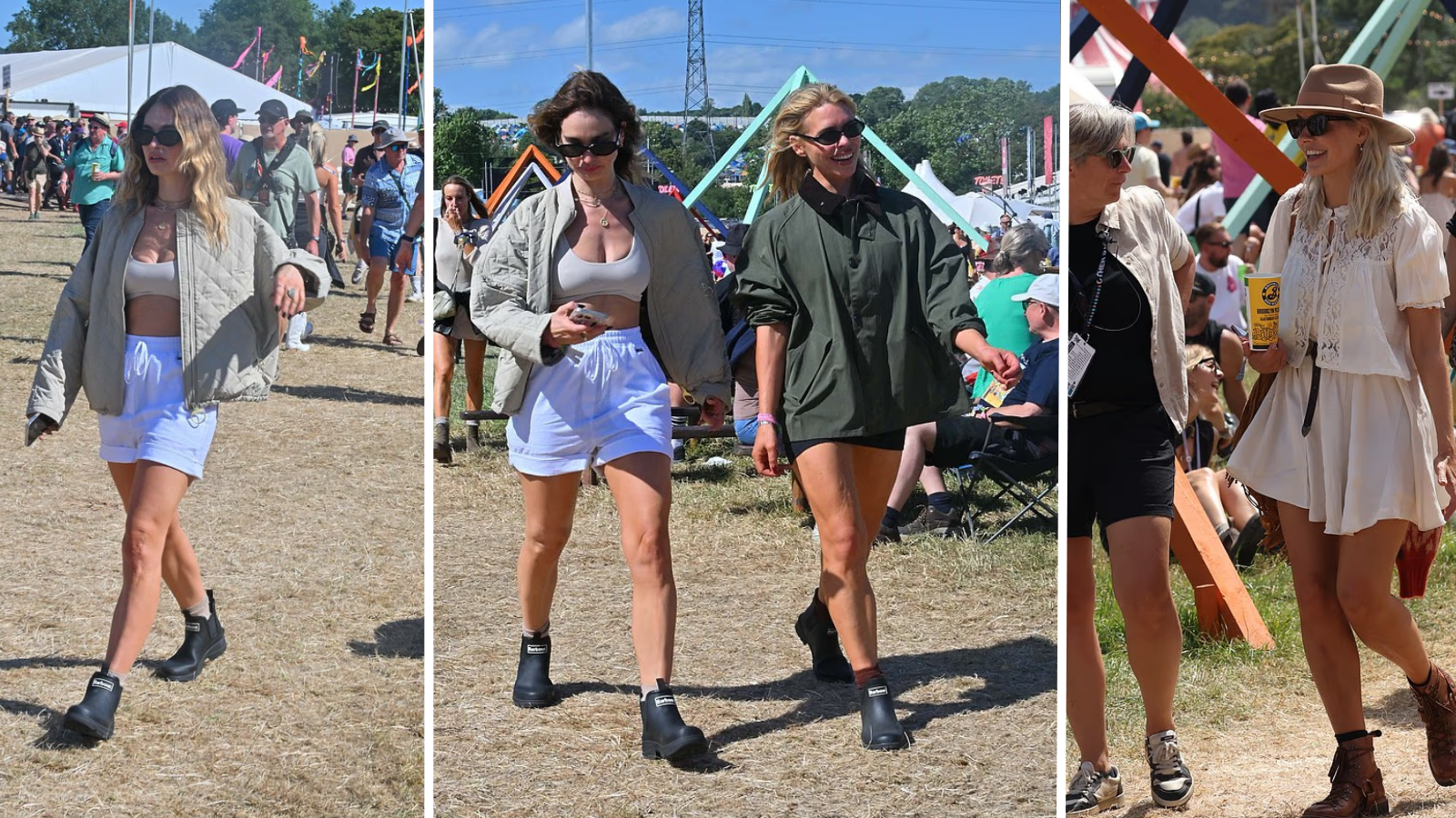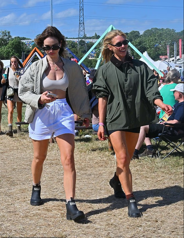 The 36-year-old Cinderella star was seen walking through Worthy Farm wearing a stylish light grey quilted Barbour jacket, a sports bra, white drawstring shorts, and black Barbour wellington boots as the festival began on Friday.