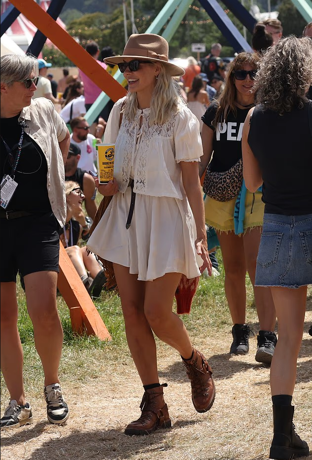 Meanwhile, Anya Taylor-Joy made her annual visit to the festival, watching Alanis Morissette perform from the side of the stage. Model and singer Pixie Geldof was also spotted, wearing a brown oversized wax jacket paired with a white boob tube, belted straight-leg jeans, boots, and oversized sunglasses.