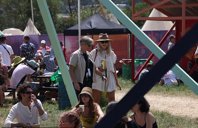 TV presenter Holly Willoughby, 44, a regular at the festival, arrived by helicopter from London and quickly got into the festival spirit, walking around the grounds with a friend to kick off the three-day event in Somerset.