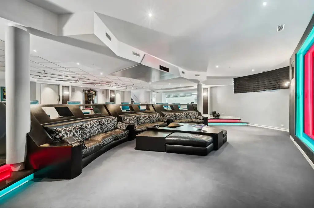 Inside, the mansion features a movie theater, commercial gym, cigar lounge, wine cellar, pool tables, bars, a salon, saltwater aquariums, and a full basketball court for ultimate luxury and entertainment.