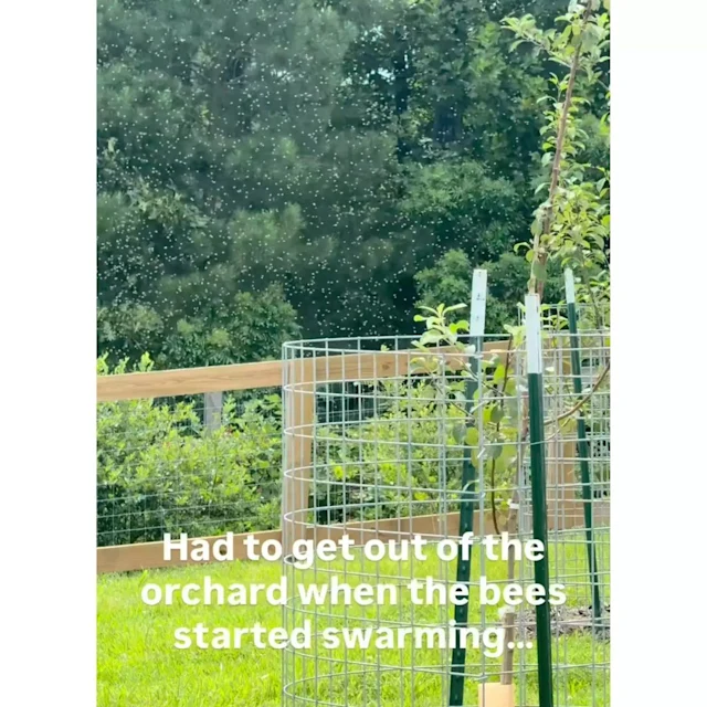 She captioned the clip, “Had to get out of the orchard when the bees started swarming…”