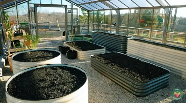 The greenhouse is filled with various planting beds, including L-shaped, rectangular, round, and outdoor raised beds.