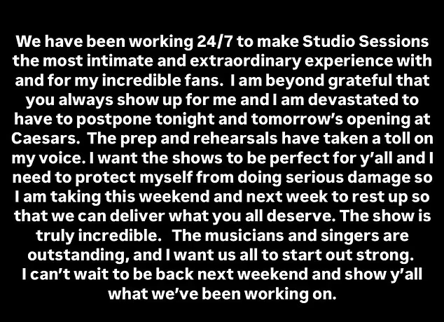 She expressed deep gratitude for their support but said she was “devastated” to postpone the opening shows at Caesars.