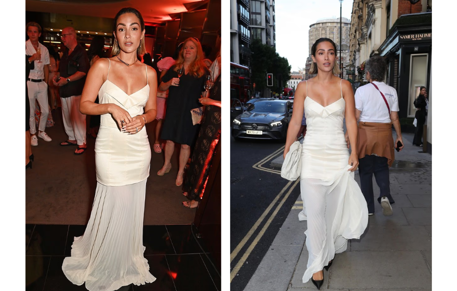 Frankie Bridge, former Saturdays singer, looked elegant in a white maxi dress with a sheer skirt and spaghetti straps, finishing her look with slicked-back hair and a delicate gold necklace.