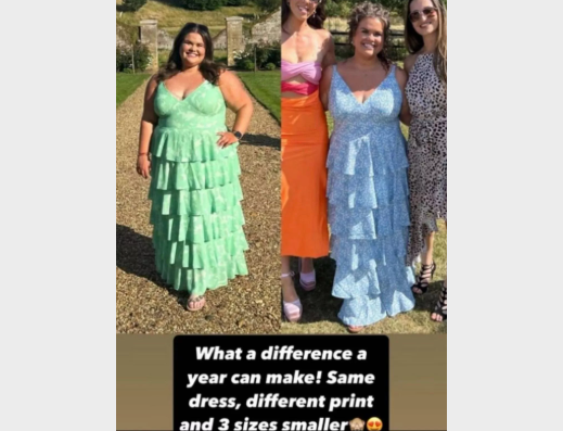The 25-year-old shared a striking before-and-after photo on Instagram, sporting the same style of dress in a different pattern, and captioned it: “What a difference a year can make! Same dress, different print and three sizes smaller.”