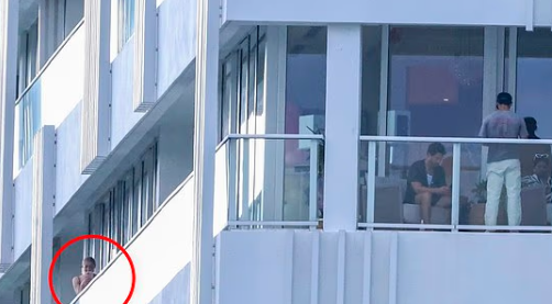 And Turner stayed on the far end, on the other corner of her ex’s balcony by herself as she caught up with someone on the phone.