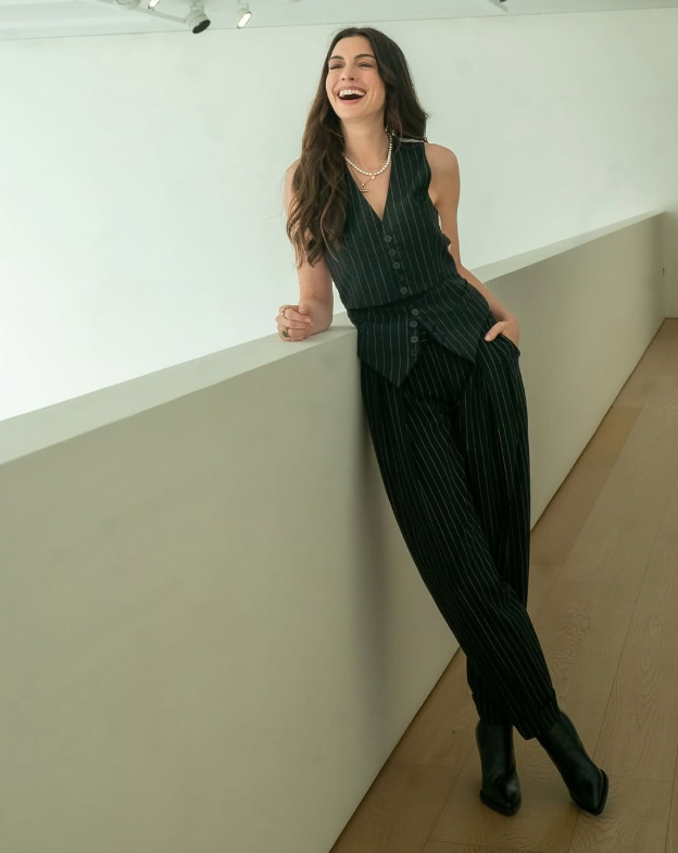 The 42-year-old actress shared a first-look photo of herself in costume while filming The Devil Wears Prada 2. The photo, posted to Instagram on Monday, sees Hathaway in a pin-striped vest and matching trousers, which she paired with pointed-toe boots and a gold T-bar necklace.