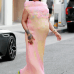 On Tuesday, Aug. 5, the 37-year-old Fenty founder stepped out in Los Angeles wearing a floor-length pastel-colored dress with a structured neckline. The sleeveless ensemble features a pink and yellow pattern with subtle baby blue and neon yellow accents.