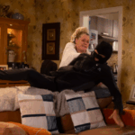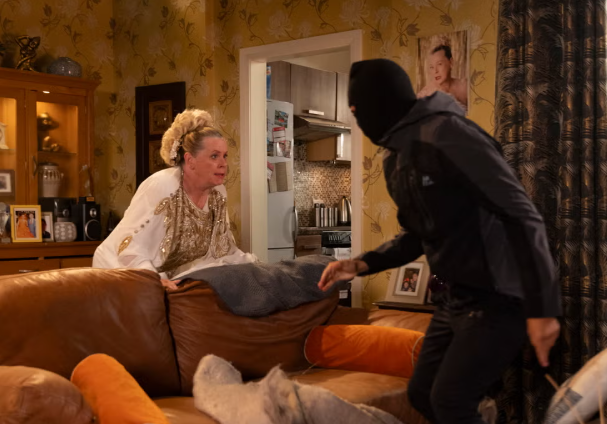 When Bernie arrives, she disturbs a burglar and boldly goes on the attack, pulling off their balaclava.