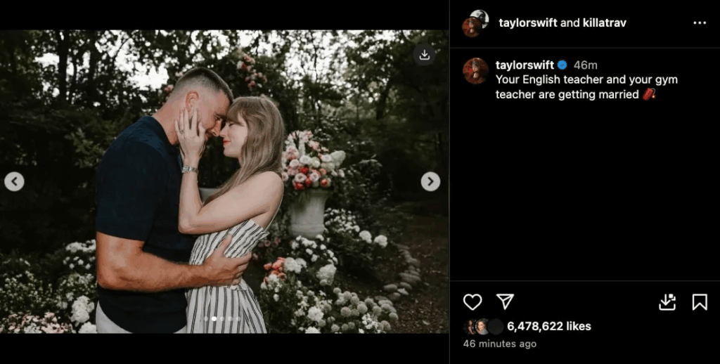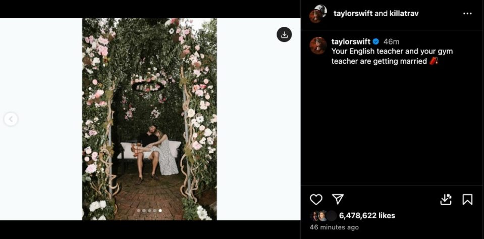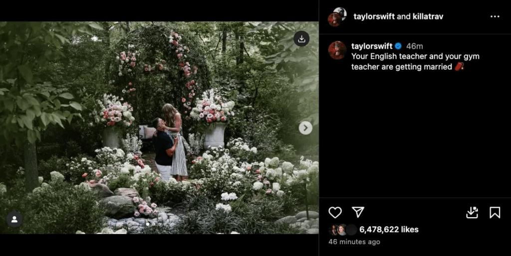 Taylor Swift announced her engagement to Travis Kelce on Instagram Tuesday afternoon, sharing a carousel of photos taken in a beautiful garden filled with white flowers. She captioned it, “Your English teacher and your gym teacher are getting married.”