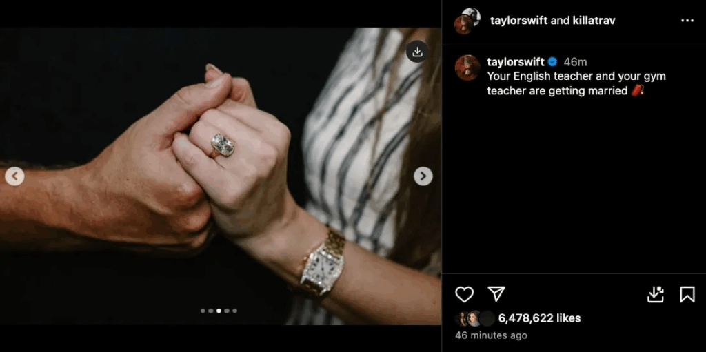 Taylor Swift posted beautiful photos of the proposal on Instagram, showing the couple embracing in a flower-filled grove and flaunting a huge diamond ring. Her post gained over a million likes within just 10 minutes.
