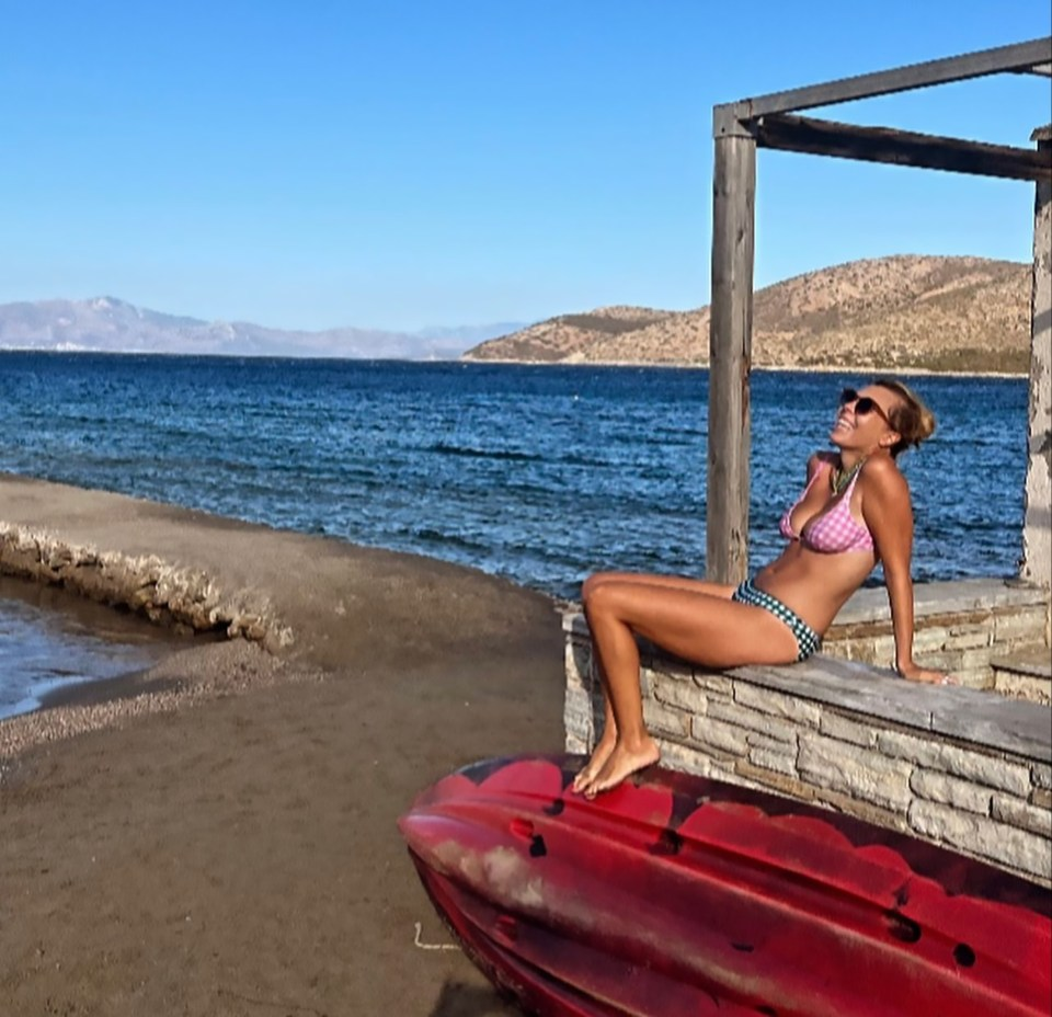 Carrie, 37, wore a patterned two-piece swimsuit and posed in the Greek sunshine for a stylish photo.