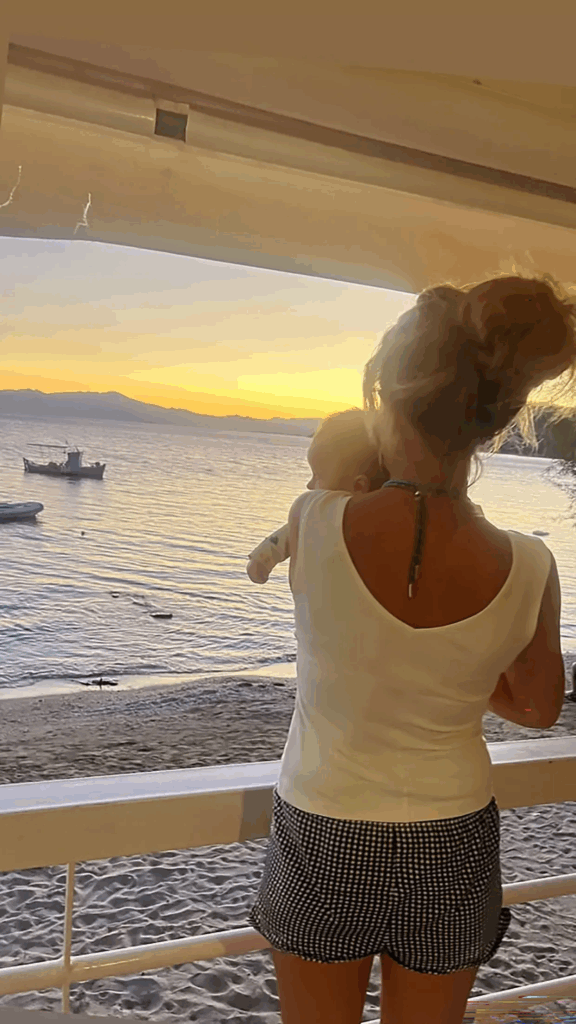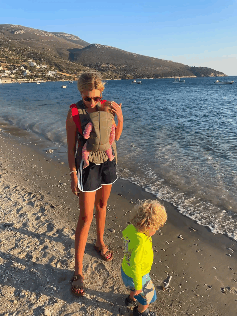 In one picture, she carried baby Poppy in a sling while her son Wilfred played in the sand nearby.