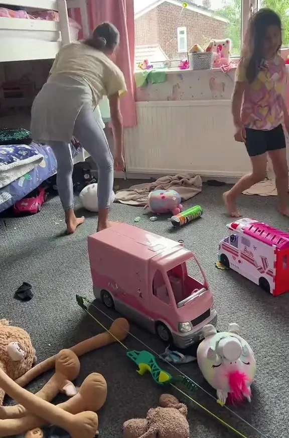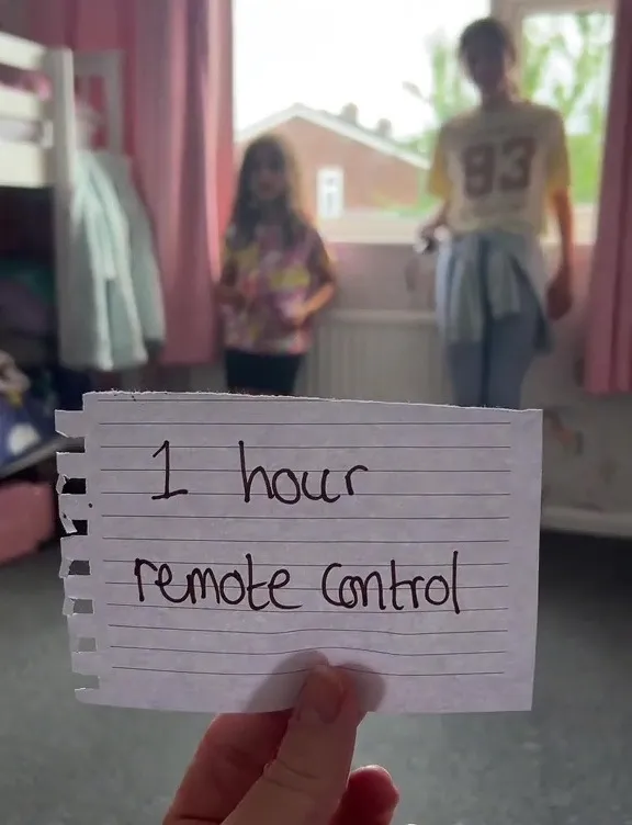 She explained she has five prizes to motivate the kids. These include sweets, a voucher to skip chores for a day, and an hour of remote control which she says is highly valued. Each prize is linked to a specific item in the room, and whoever tidies that item wins the corresponding prize.