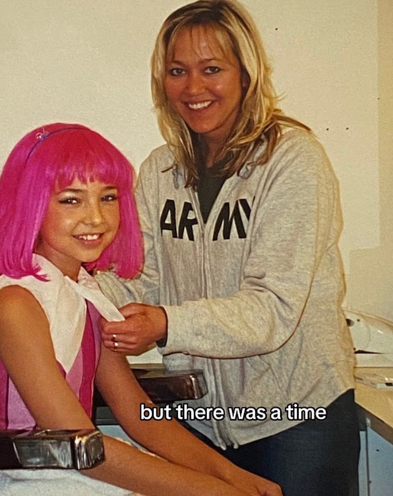 Shelby Young shared a throwback on TikTok, captioning a current photo: “I don’t have pink hair anymore, but there was a time…” She followed it with behind-the-scenes pics from filming the LazyTown pilot in 2002, adding, “(Jk it was a wig).”