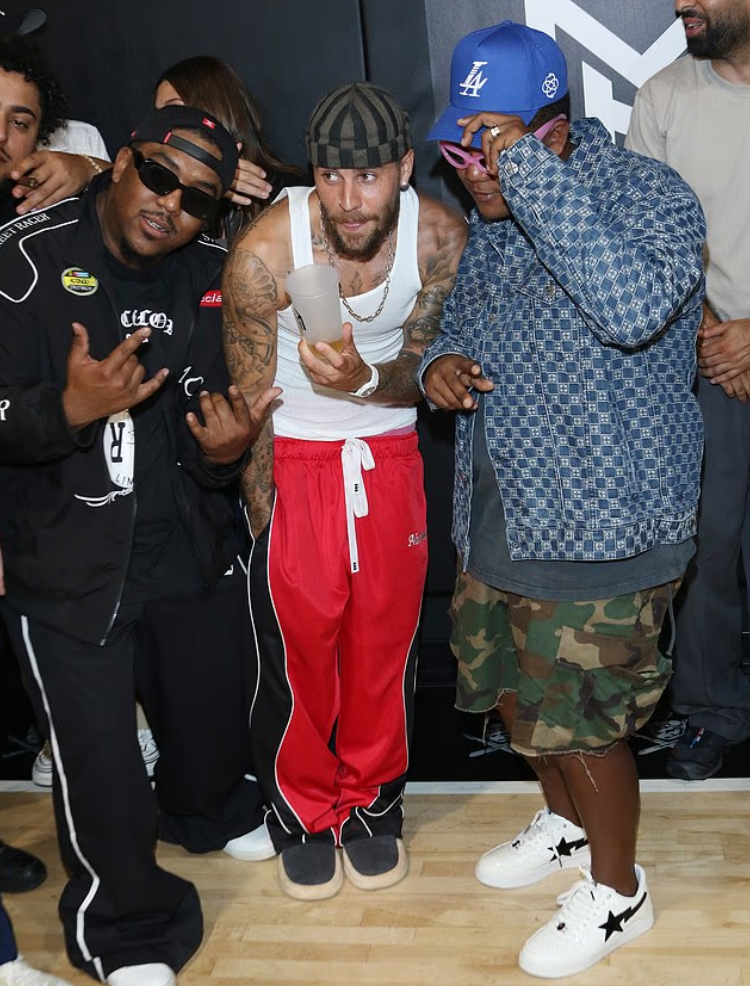Justin Bieber completed his laid-back look with comfy trainers, gold jewelry, and a beard as he greeted celebrity guests like Machine Gun Kelly.