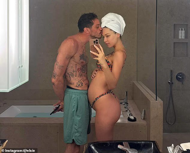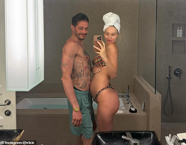 Pete Davidson’s pregnant girlfriend, Elsie Hewitt, shared playful vacation photos from Greece on Friday. The 29-year-old model posed in a bikini, showing off her baby bump in a hotel bathroom.