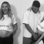 As she faces away, the back of her shirt reads, “If he wanted to he would…” and as she spins around, the front reads, “…and he did.” Edwards displays her pregnant belly, smiling as she reveals her happy news. Her fiancé then joins her in the video and gives her a kiss before their 4-year-old son Axel comes in for a group hug.