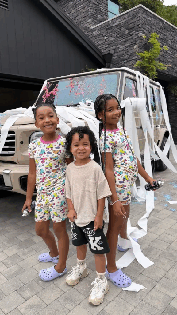She then posted a picture of True, Chicago and her son, Tatum, 3, standing in front of their stunt masterpiece the girls wearing matching roller skate pajamas and purple Crocs while Tatum wore a tan T-shirt, KITH black shorts and sneakers. The smiles on their faces said it all.