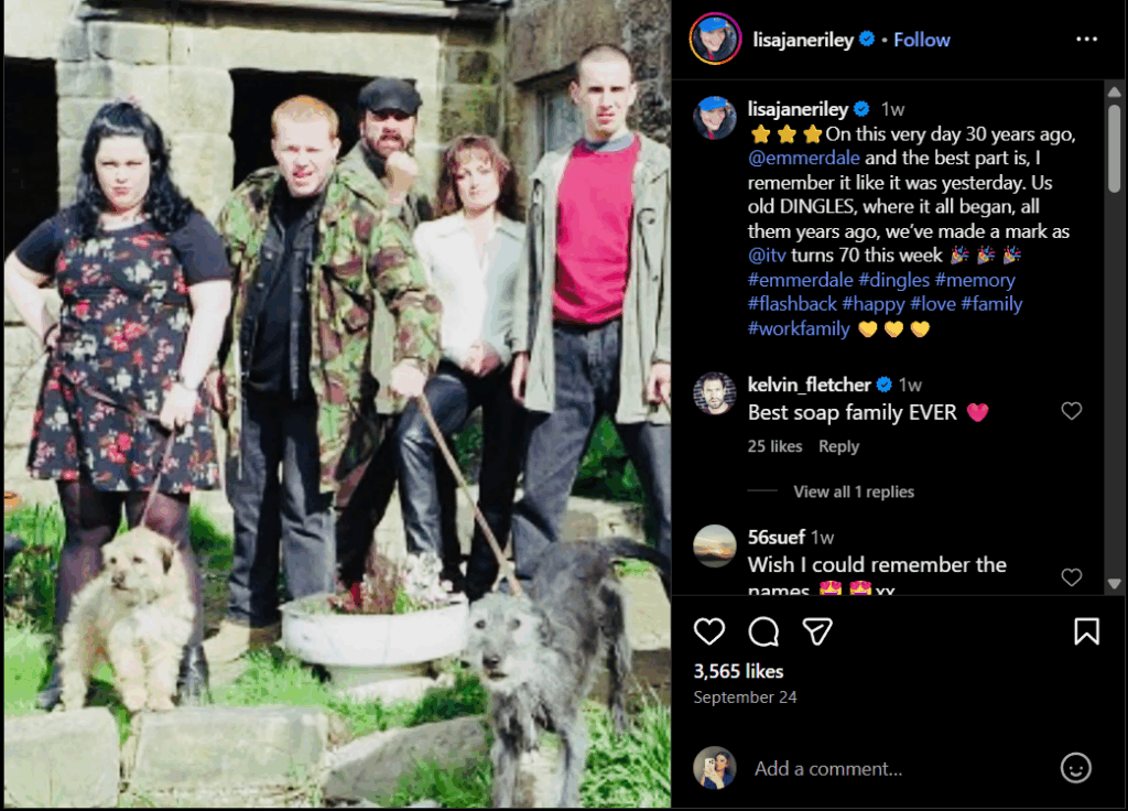 The Instagram post, shared by Lisa Riley, who plays Mandy Dingle, featured the first appearance of the Dingle family in the village, showing Mandy, Butch, Zak, Tina, and Sam though only two of them remain in the village today.