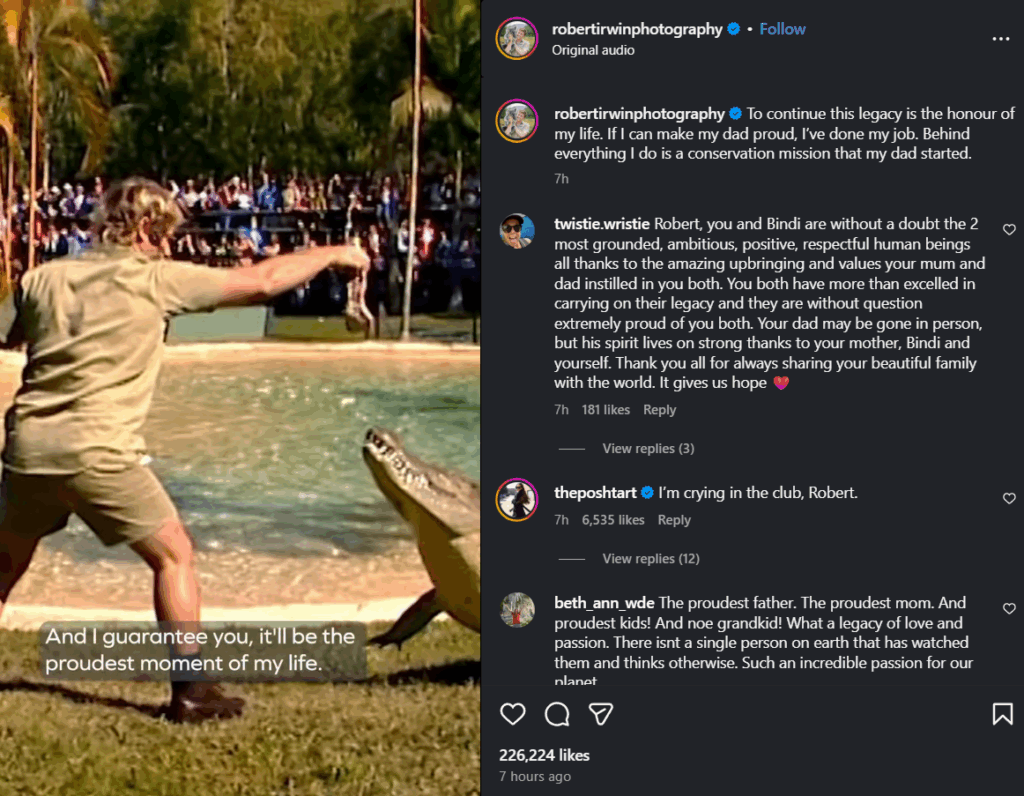 The post included a nostalgic video of Steve Irwin, visibly emotional, speaking about his family and his enduring love for wildlife.