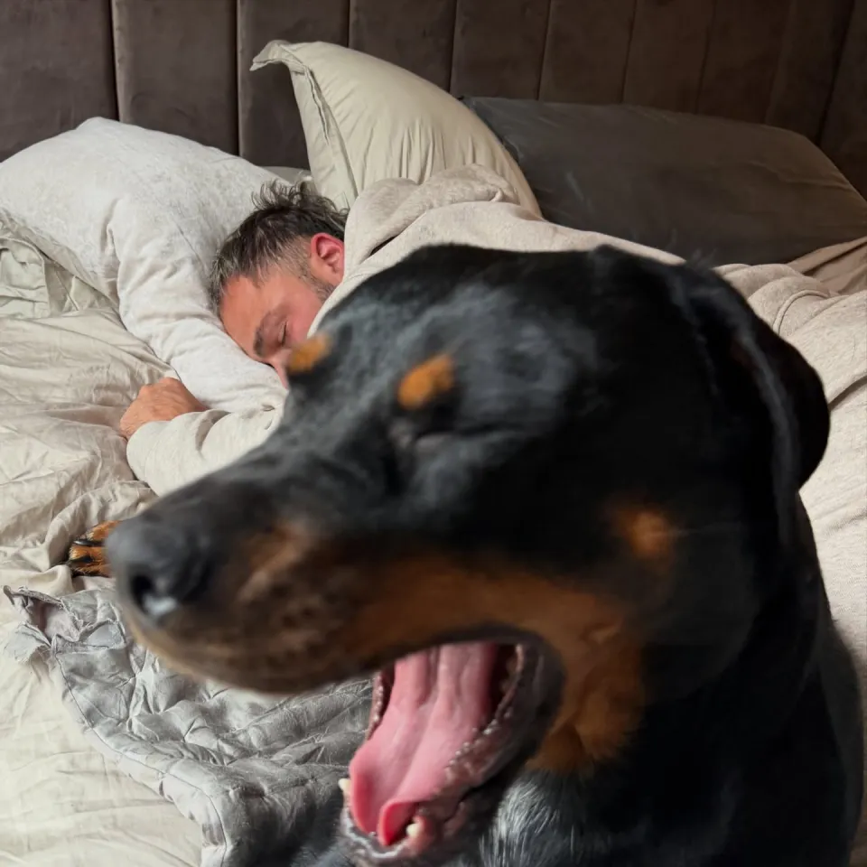 A collage featured four images of Olivia in a stylish formal outfit, with the caption: “I’m exactly who I think I am.” Another shot showed her husband Brad in bed with one of their dogs, suggesting home life remains calm.