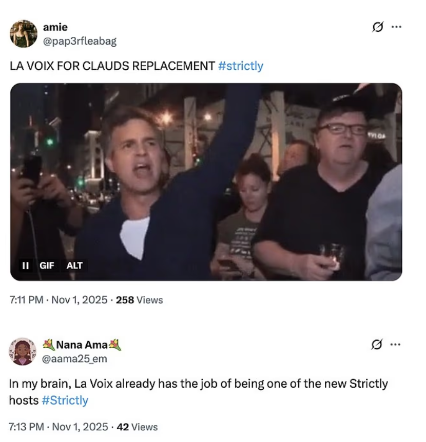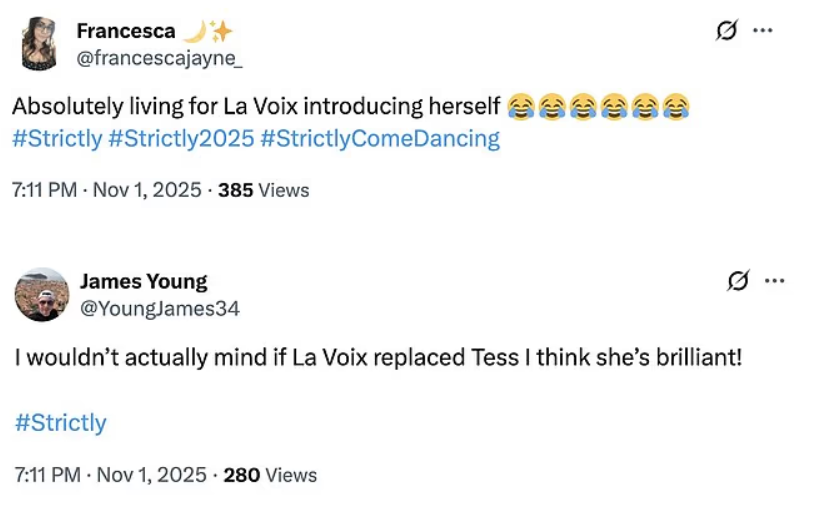 Fans quickly flooded social media praising La Voix, insisting she has the charisma and humor to step into the presenting role. Comments included: “La Voix has the personality and humour to be one of the new Strictly presenters,” “Everything she does or says is gold,” and “Love to see La Voix with the job.”