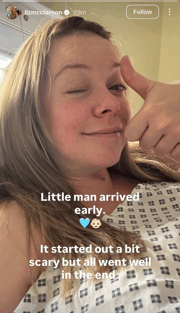 Liz McClarnon and her husband Peter Cho have welcomed their first child following years of challenging IVF, posting a hospital selfie with a thumbs-up on Sunday.