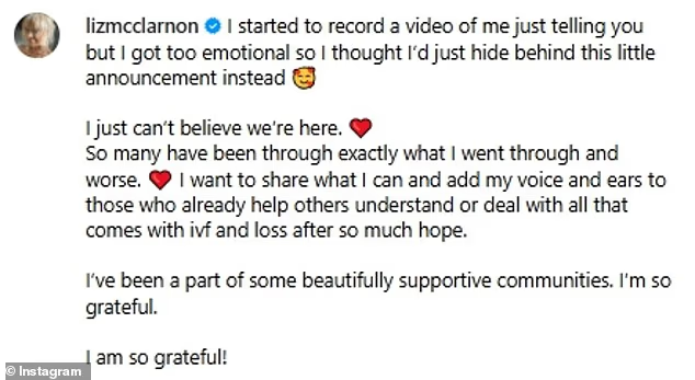 She explained in her Instagram post that she initially tried to record a video announcement but became too emotional, so she chose to share a simple post instead. Liz reflected on the struggles she and many others face with IVF and pregnancy loss, expressing gratitude for the supportive communities she’s been part of and vowing to use her voice to help others navigate similar experiences.