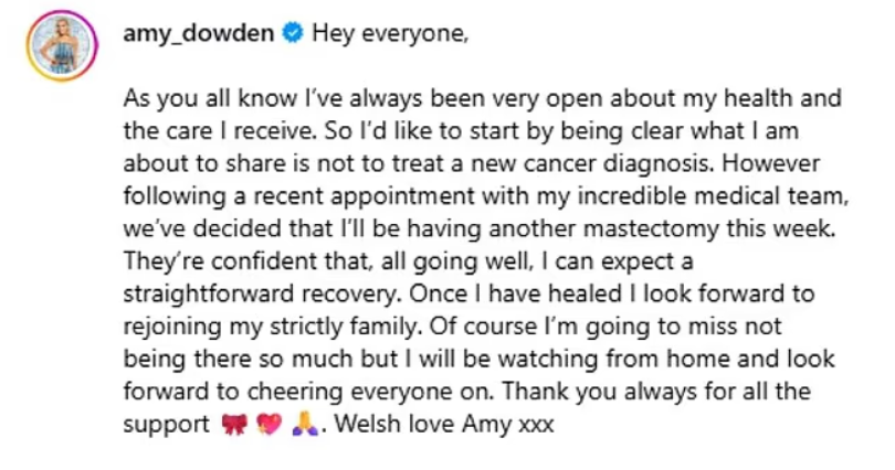 Amy ended her message by saying, “Once I’ve healed, I can’t wait to rejoin my Strictly family. I’ll really miss being there, but I’ll be watching from home and cheering everyone on. Thank you, as always, for all the support. Welsh love, Amy xxx.”