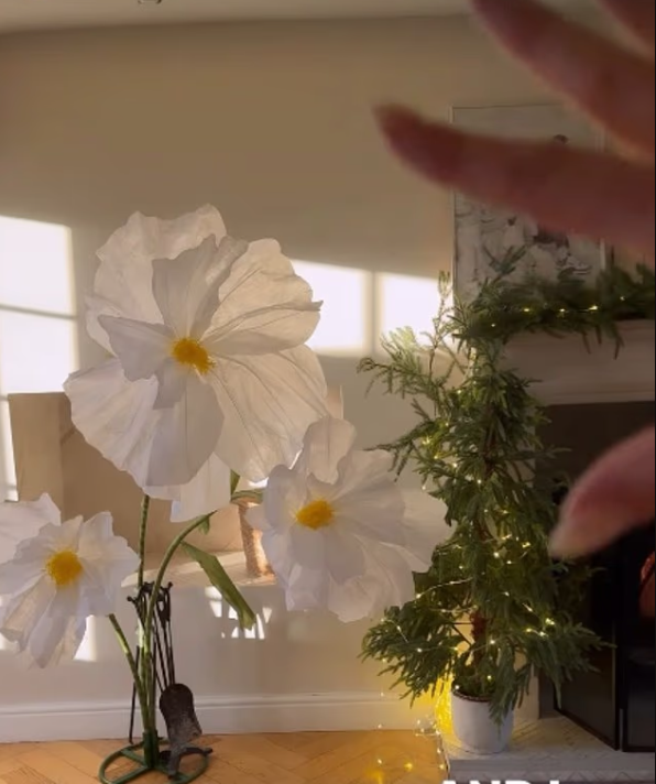Her second tree followed a white theme, decorated with the same oversized £70 faux flowers, twinkling lights, and pine cones.