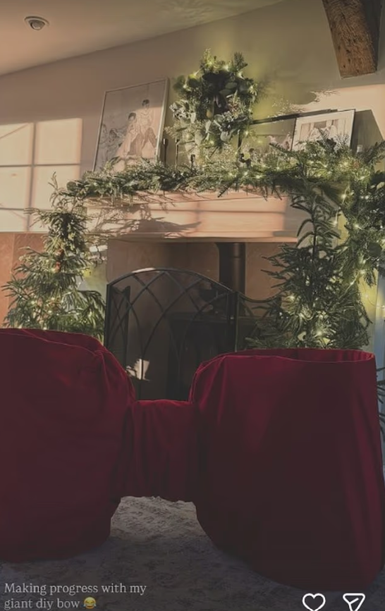 Elsewhere around Pickle Cottage, the Sort Your Life Out presenter draped a decorative garland over the fireplace and shared that she’s been busy crafting a huge red bow.