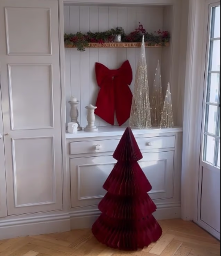 In her lounge, Stacey displayed a striking red-themed Christmas tree adorned with giant £70 artificial flowers, ribbons, roses, and berries. On the same bookshelves, she added an £80 red paper tree decorated with a garland and bow.