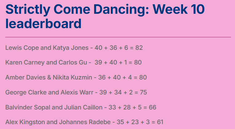 After the challenge, the judges awarded Lewis Cope the full six points, followed by Balvinder Sopal with five, Amber Davies with four, Alex Kingston with three, George Clarke with two, and Karen Carney with one point.