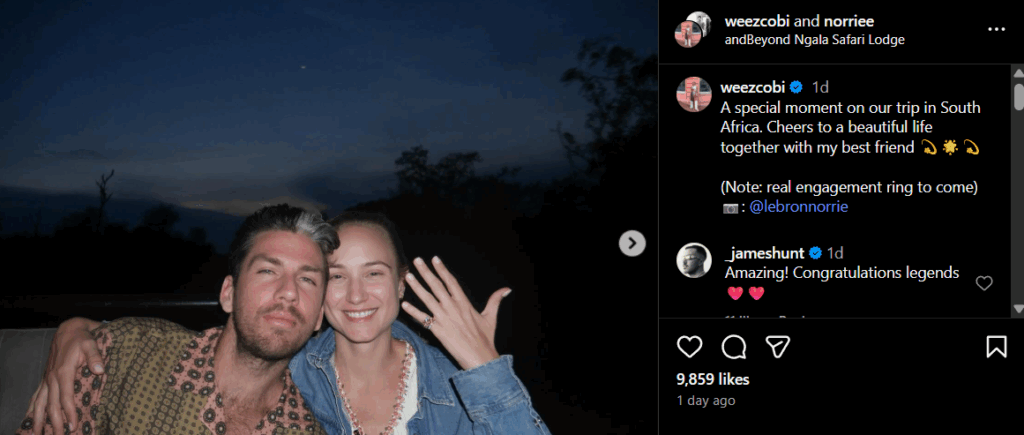 The couple shared the happy news on Instagram, posting snapshots from their trip to South Africa, where the proposal took place during a safari adventure.