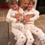 Wearing matching plaid pyjamas embroidered with tiny Christmas trees, the couple shared a sweet kiss while little Bambi, now two, beamed at the camera like she’d been rehearsing for a holiday card shoot.