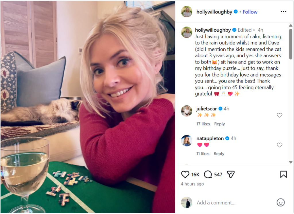 She said: “Just having a moment of calm, listening to the rain outside whilst me and Dave (did I mention the kids renamed the cat about 3 years ago, and yes she answers to both) sit here and get to work on my birthday puzzle… just to say, thank you for the birthday love and messages you sent… you are the best! Thank you… going into 45 feeling eternally grateful.”