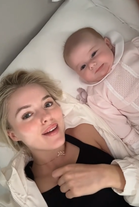 In a recent Instagram story, she posted an adorable photo of baby Lila Grey tucked up in bed. Lila was dressed in a pink zip-up baby grow with a cream love heart pattern.